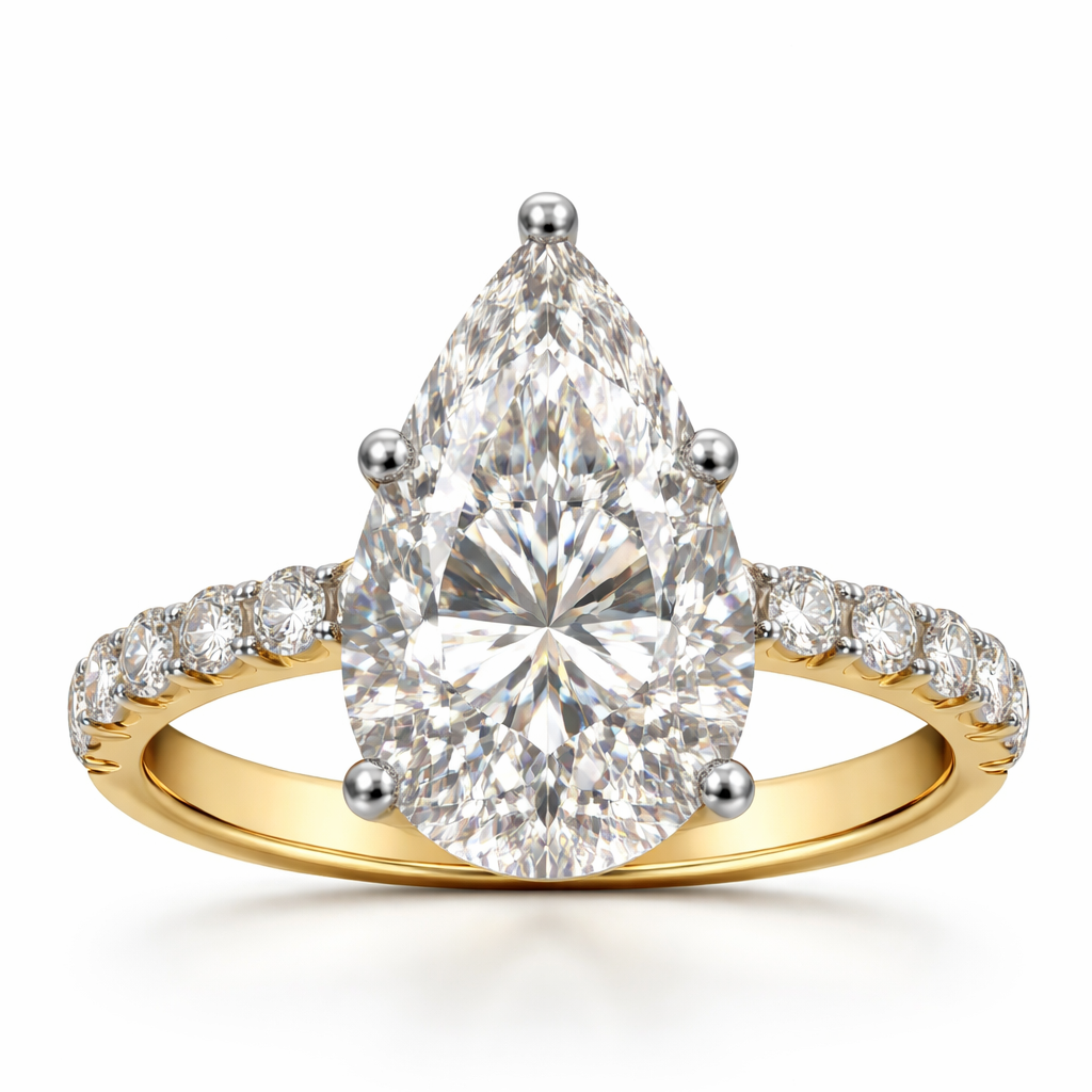 This elegant 14ct yellow gold ring features a stunning 3.35ct pear-shaped lab grown diamond, set in white gold claws to maximise brilliance. Diamond-set shoulders and a subtle hidden halo add refined sparkle, creating a timeless yet modern design.