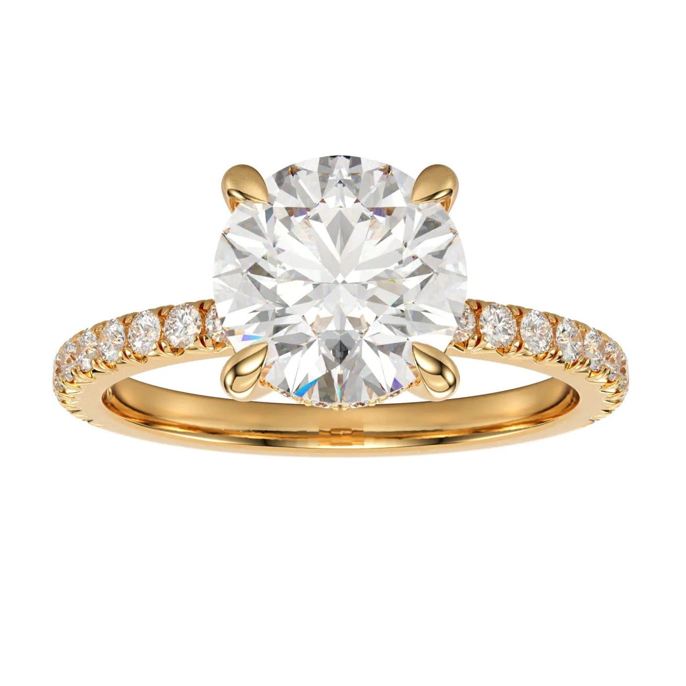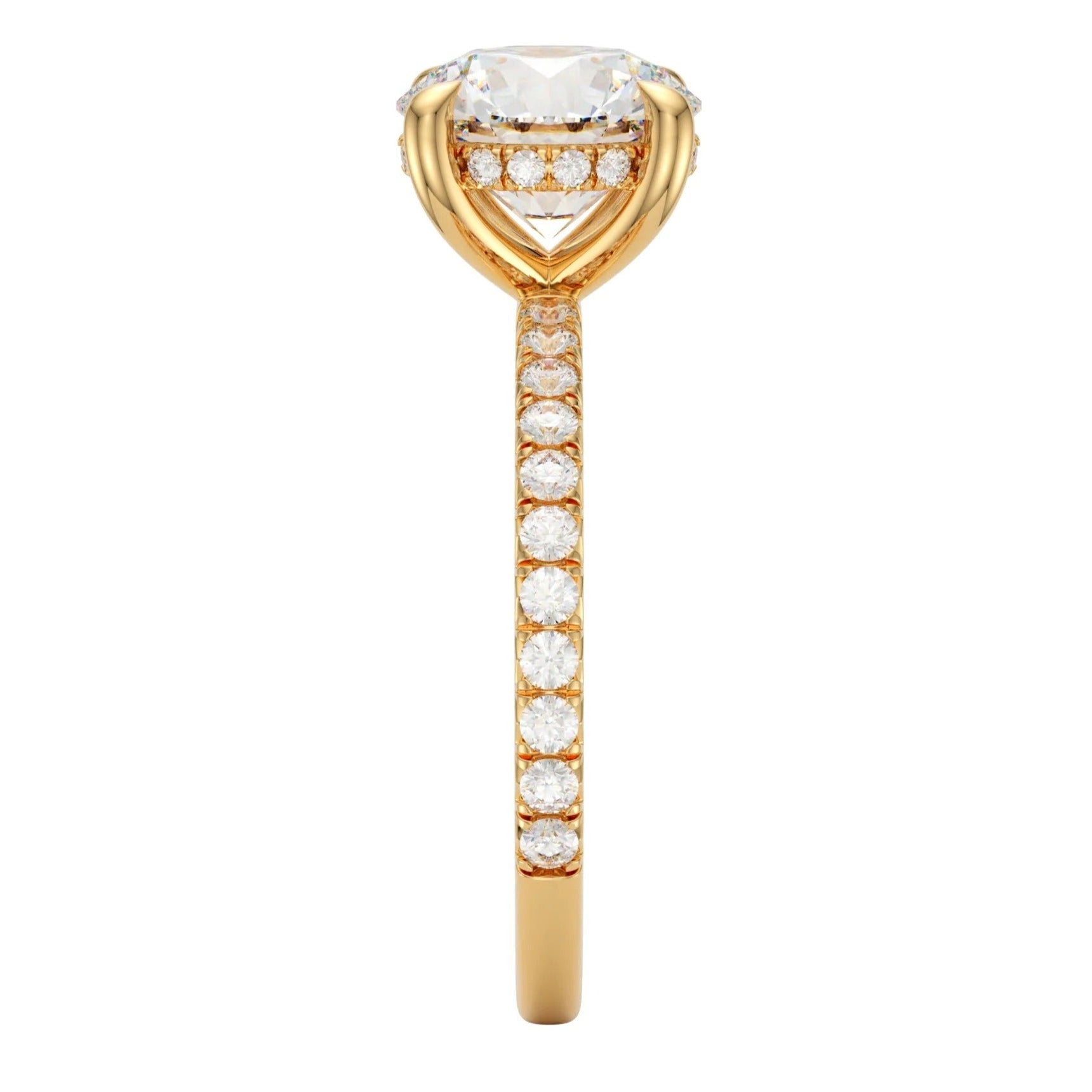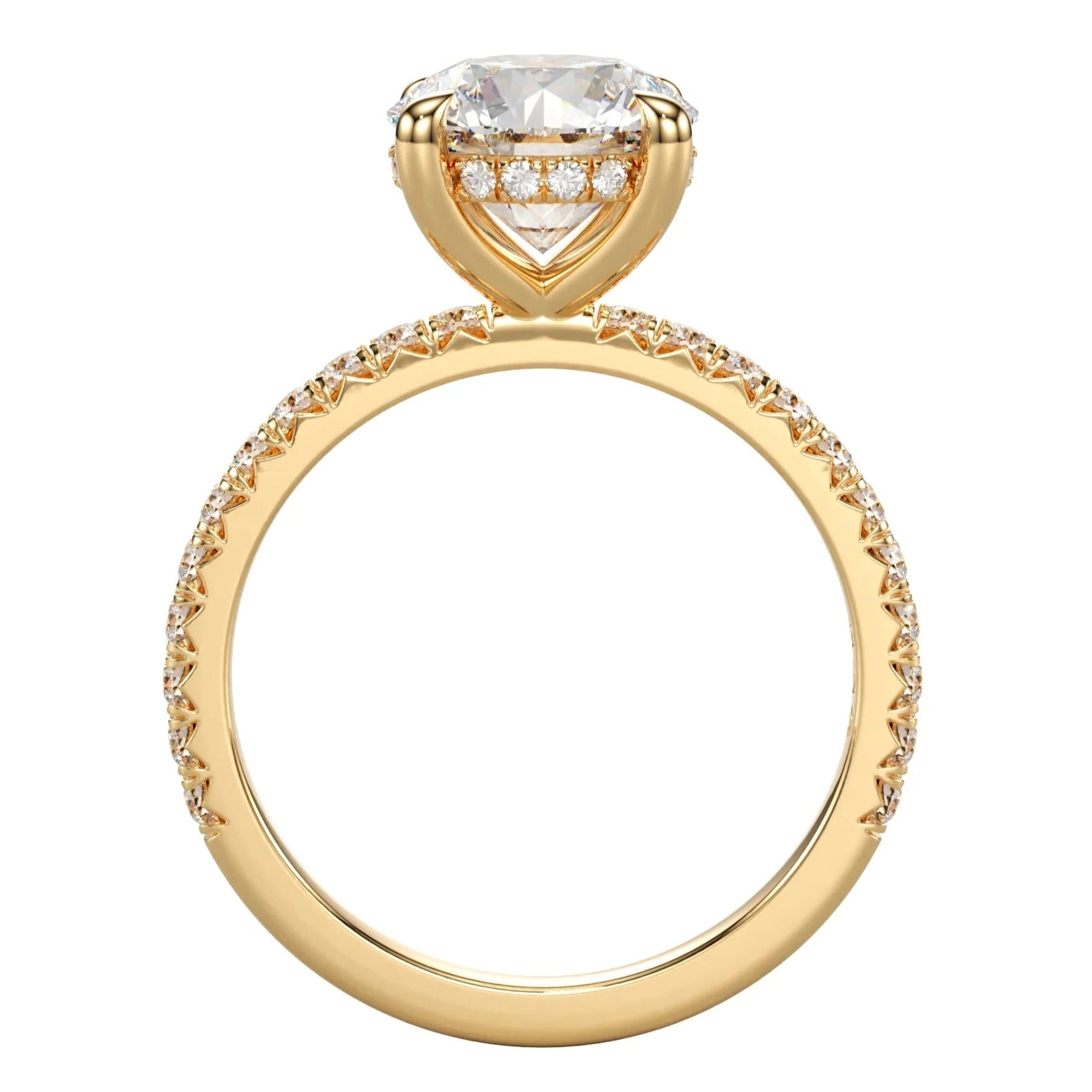 Crafted in luxurious 9ct yellow gold, this breathtaking engagement ring features a brilliant 1.75ct round cut lab grown diamond secured in a classic four-claw setting. A sparkling hidden halo delicately encircles the base of the center stone, adding a touch of elegance and extra fire from every angle. The diamond-set band enhances the ring’s radiance, making it a timeless symbol of love and sophistication.