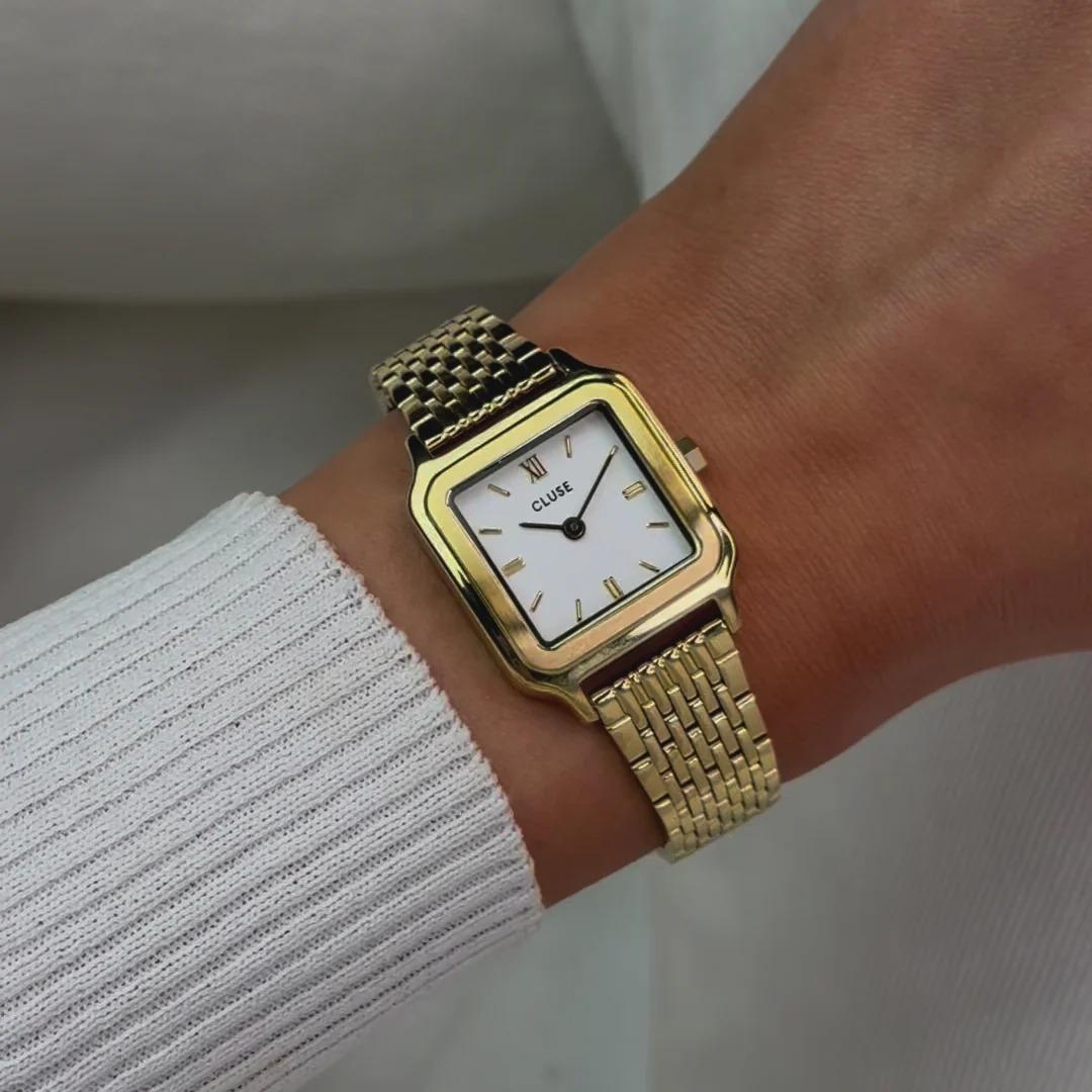 The square Gracieuse Petite watch for women features a 24 mm gold coloured case, white dial and gold coloured 14 mm 9-link stainless steel strap. Easily customise your watch with any CLUSE 14 mm strap. You can adjust the strap size by yourself.