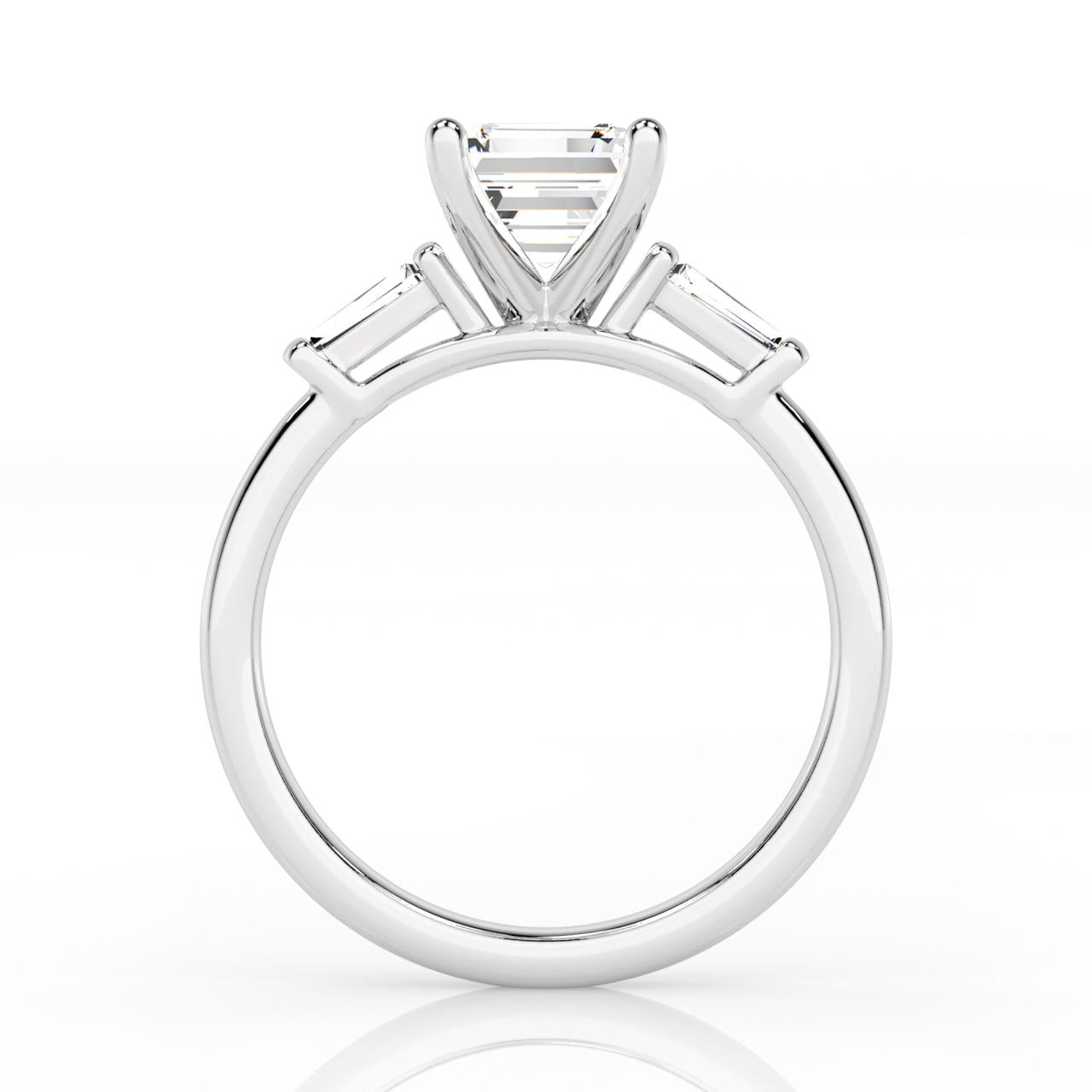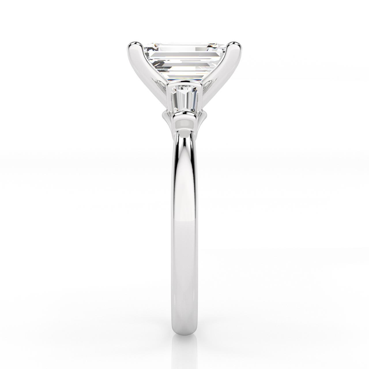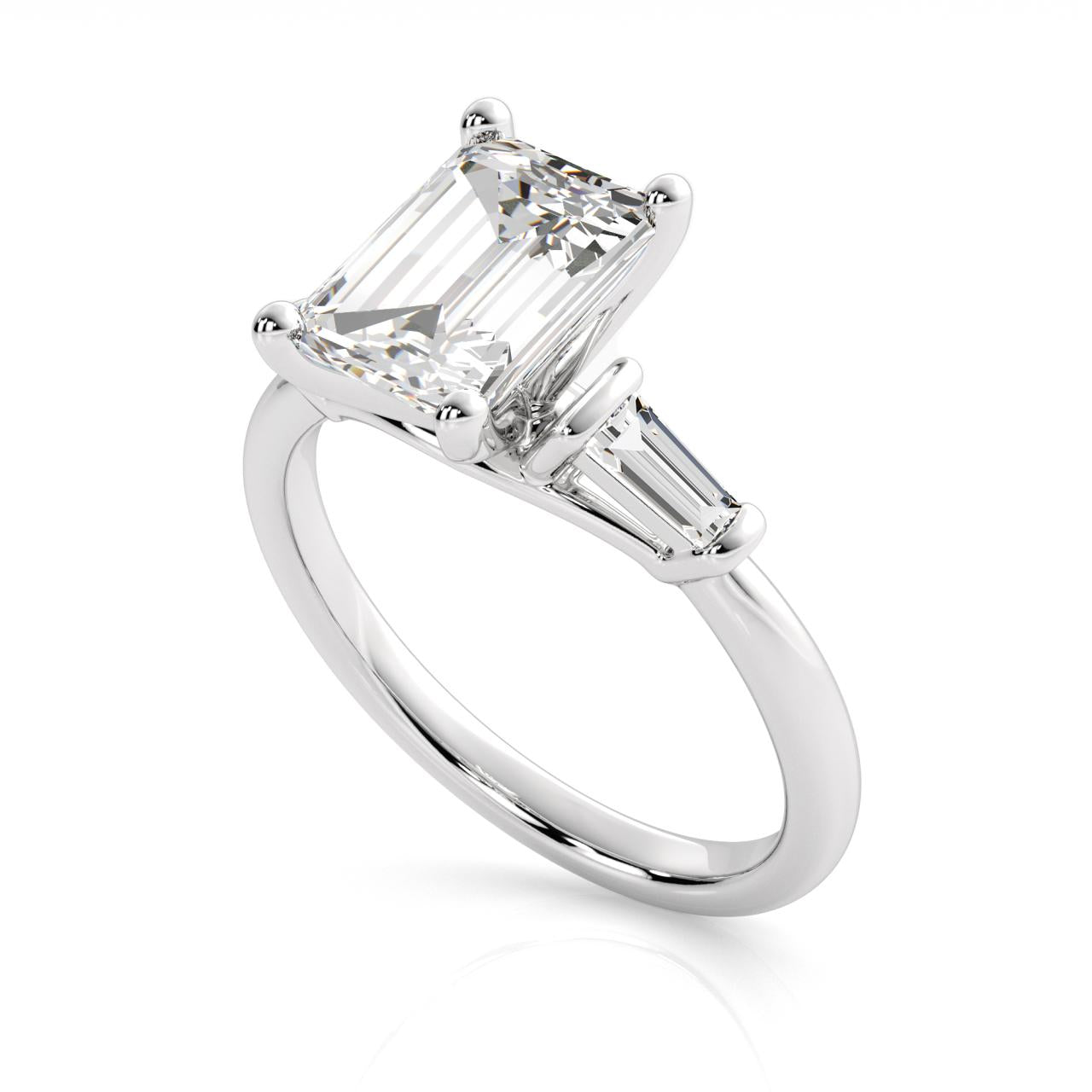 Elegant 9ct white gold ring featuring a striking emerald-cut lab-grown diamond at its heart, complemented by delicate tapered baguette accents along the shoulders. This refined piece showcases exceptional quality with a total diamond weight of 2.25 carats in E/F colour and VS clarity—a sophisticated choice for those who appreciate timeless design and ethical luxury.