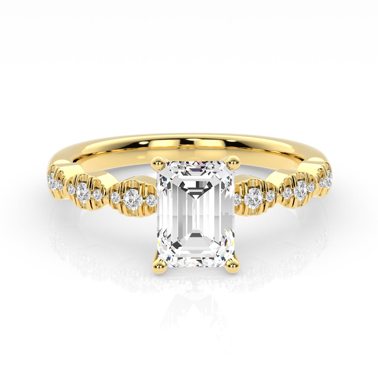 Crafted in 9ct yellow gold, this elegant ring features a stunning 1.05-carat emerald-cut lab-grown diamond at its heart, complemented by six sparkling round brilliant-cut stones adorning the band. A refined choice for those seeking timeless sophistication with a total diamond weight of 1.16 carats.