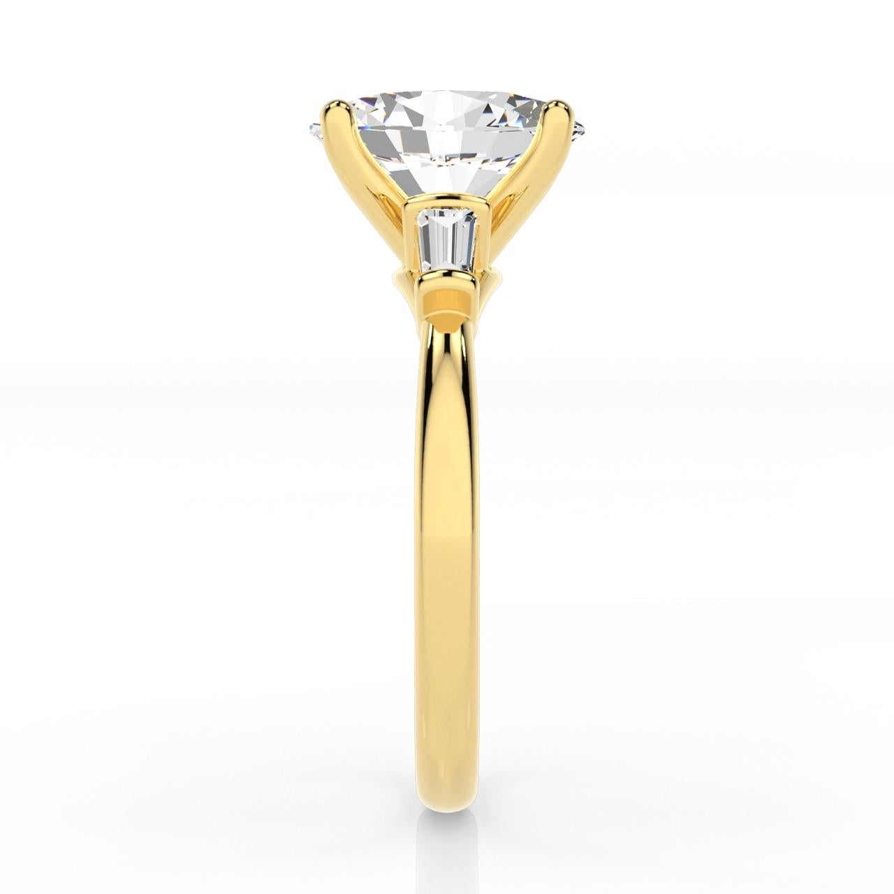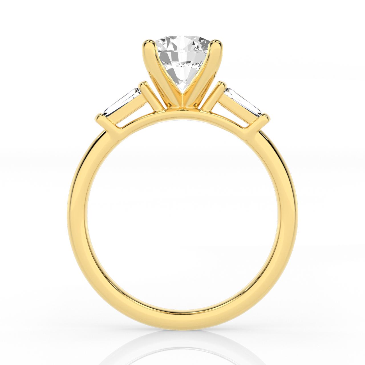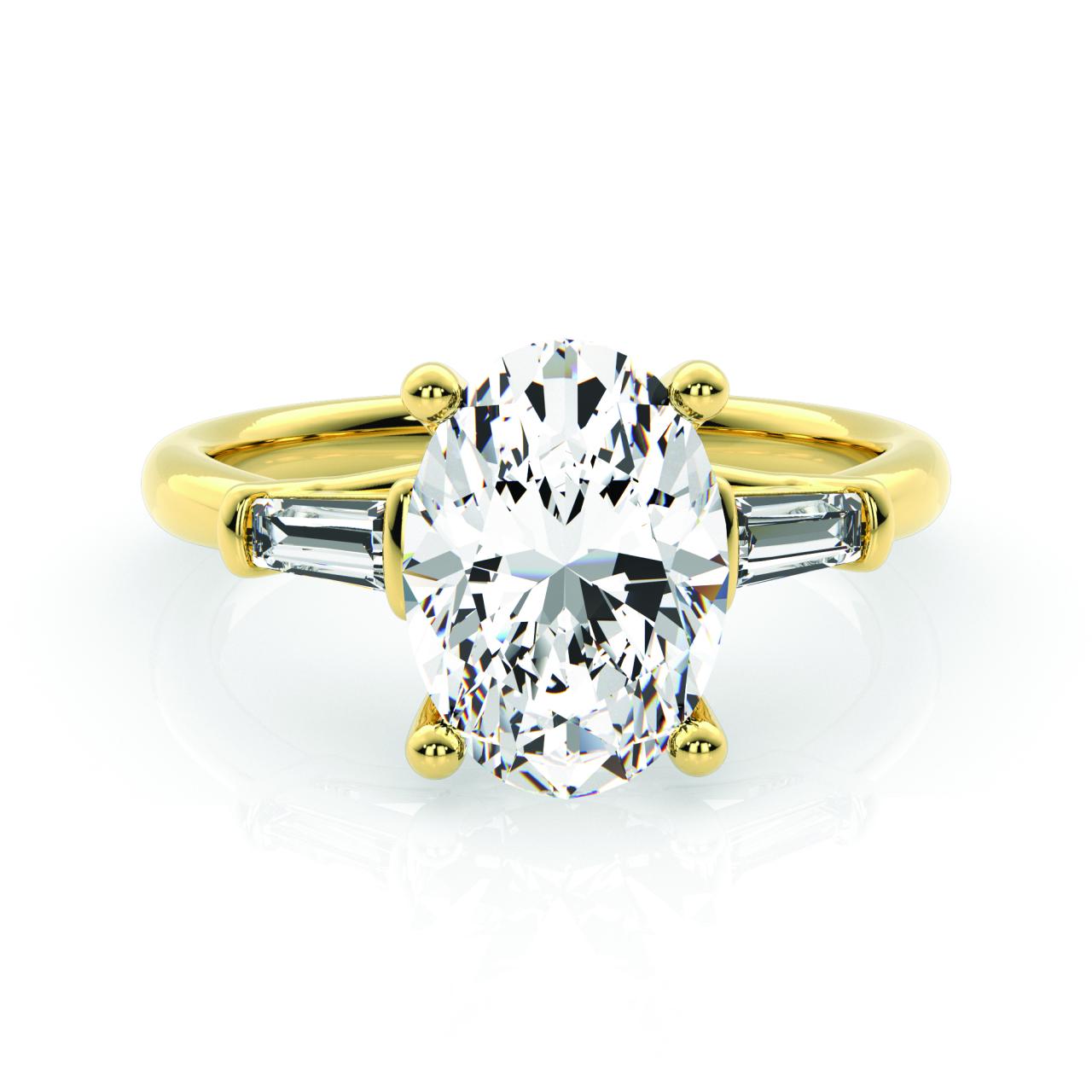 The Milan Ring is a 9ct Yellow Gold 2.29ct Lab Grown Diamond Ring, featuring a Oval 2.075 centre stone with a tapered baguette cut stone on each shoulder.