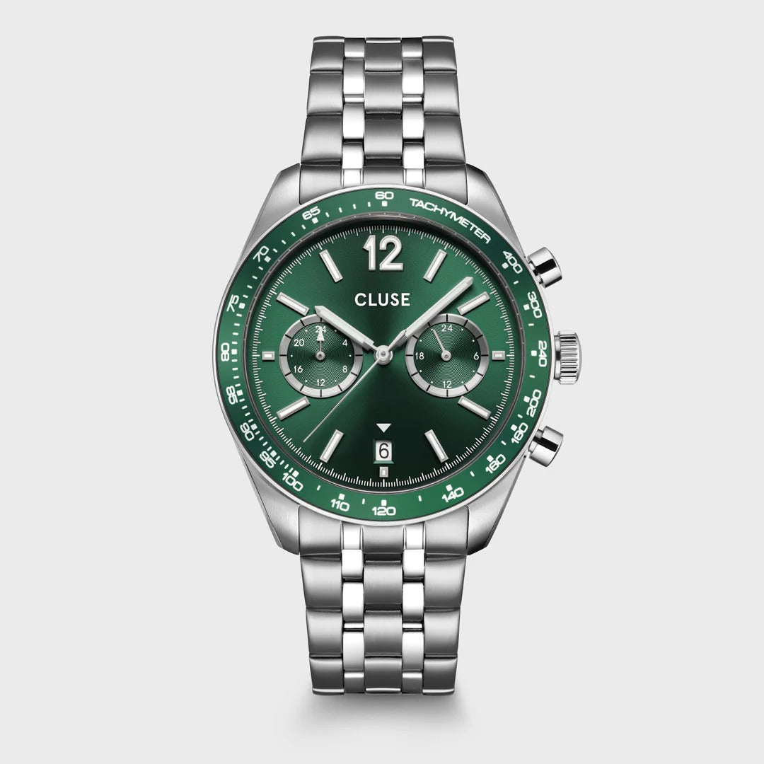 The round Aravis Dual Timer watch for men features a 41.5 mm silver coloured case, stainless steel 20 mm strap, and a green dial with a tachymeter bezel and dual time movement featuring both a date function and the ability to display two time zones.