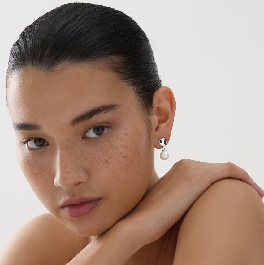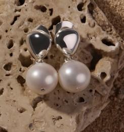 9mm Round fresh water pearl hangning from silver triangular stud fitting.