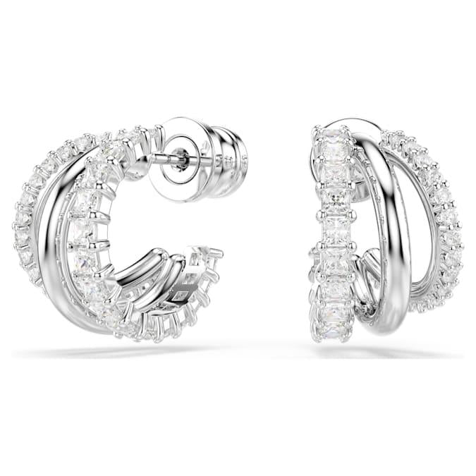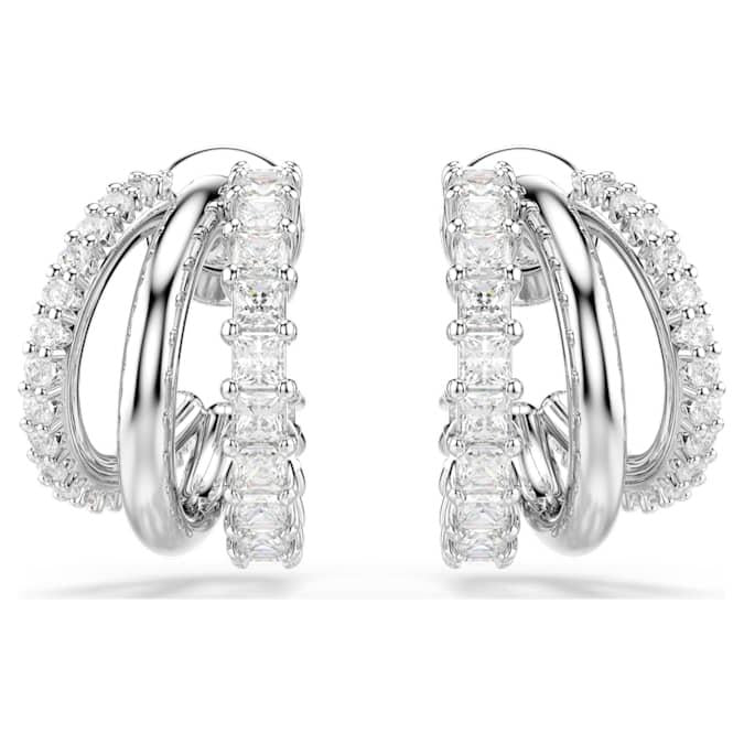 These intricately crafted Hyperbola earrings showcase a unique beauty. On each side, the three mini hoops are presented in rhodium plating, with an adornment of round and square cut Swarovski Zirconia in a prong setting. Style with a matching bangle or pendant for a show-stopping look.