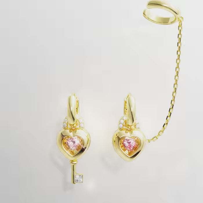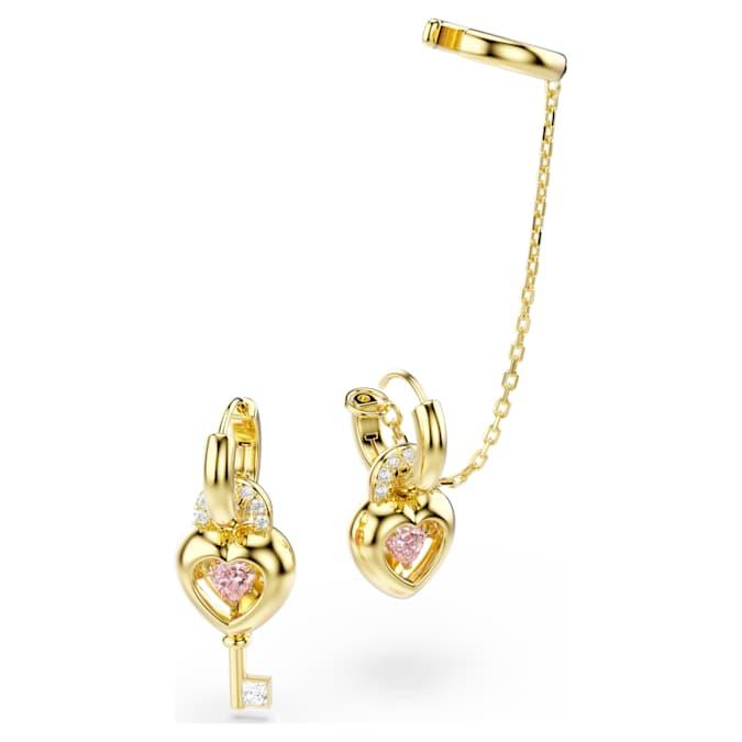 These heart-shaped Swarovski earrings combine creativity with passion. Each gold-tone plated piece is inspired by a locket, with pink dancing stones at the centre, and additional details including a dangling key and a removable ear cuff and chain. The back of each earring is coloured pink to match the pendant from the same family.