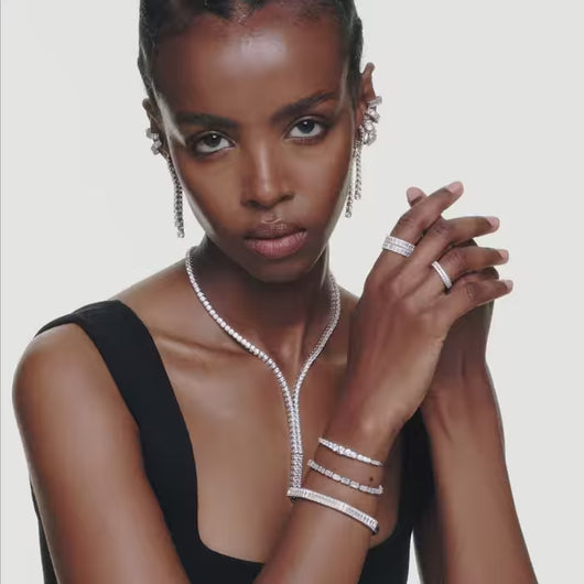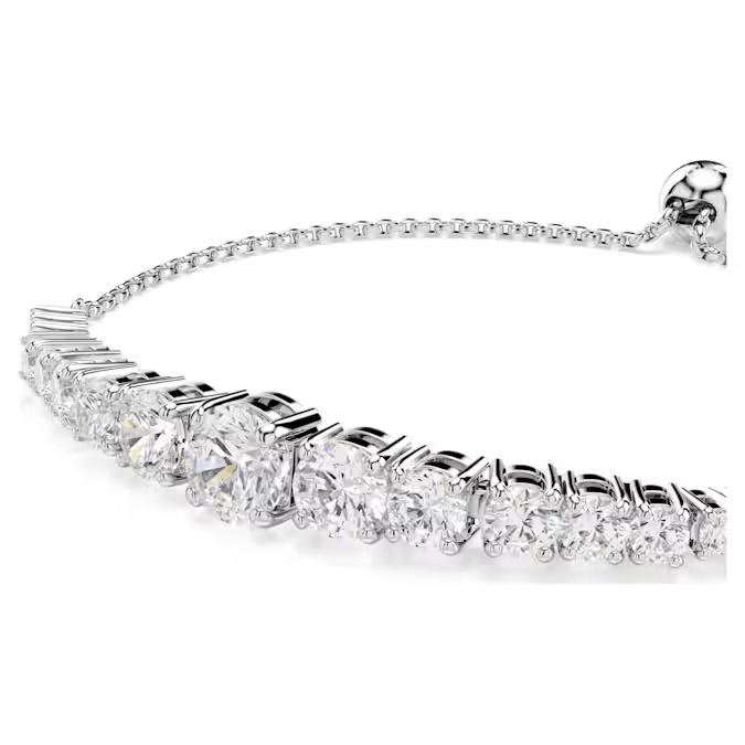 This radiant Matrix bracelet is a perfect way to let your personal style shine. Worn on a delicate chain with a sliding ball closure, the rhodium plated design is adorned in a gradient of round-cut Swarovski Zirconia, each faceted for light-reflecting wonder. Enhance the look of luxury by pairing the jewellery with a set of matching earrings or a necklace