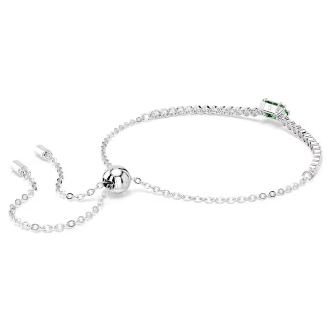 Adding a touch of radiance to any look, this classic tennis bracelet combines clear Swarovski Zirconia with a pop of colour. Fastened with a sliding closure, the rhodium plated jewellery features a uniform row of clear Swarovski Zirconia and is accented with a baguette-cut green Swarovski Zirconia at its centre. A vibrant twist on a timeless style.
