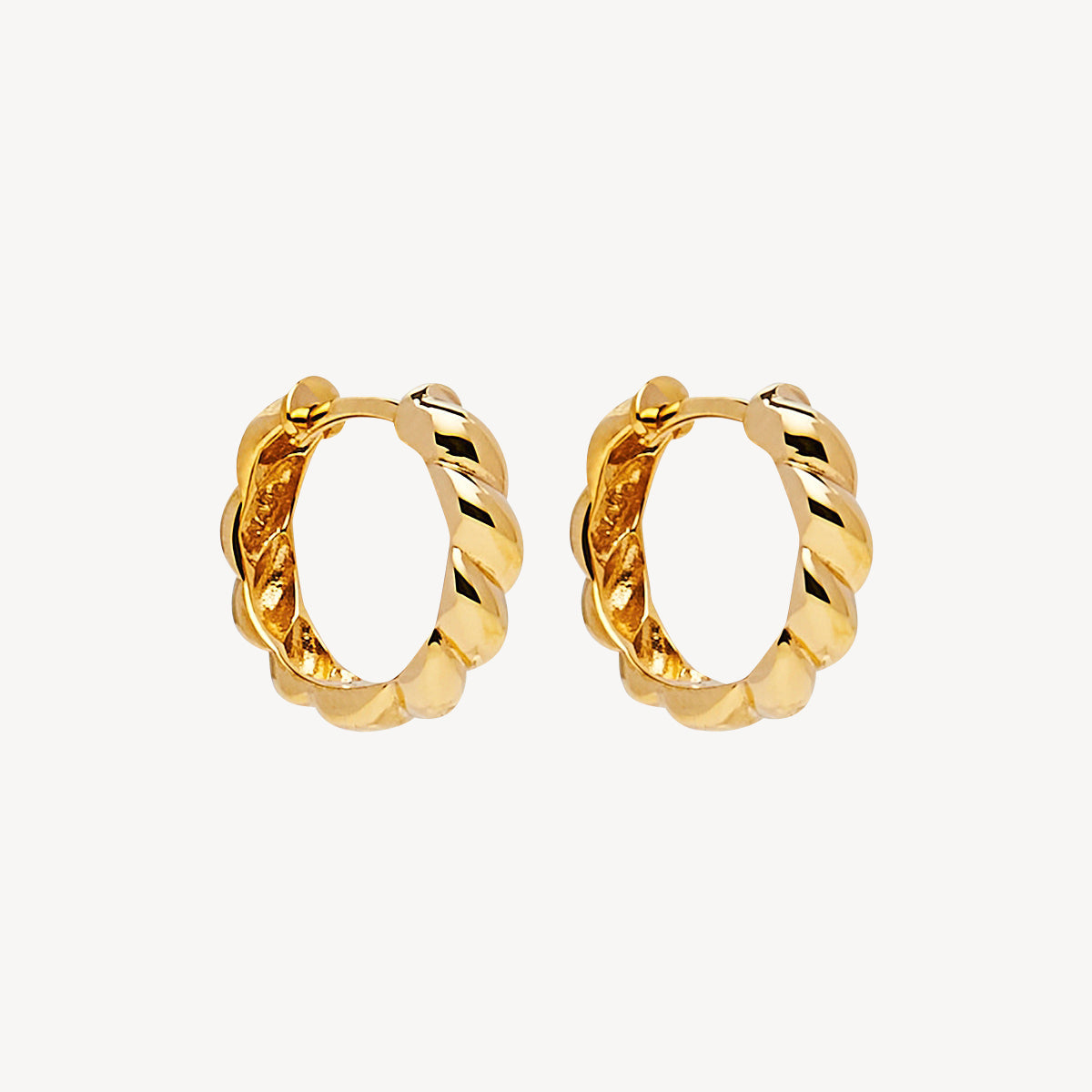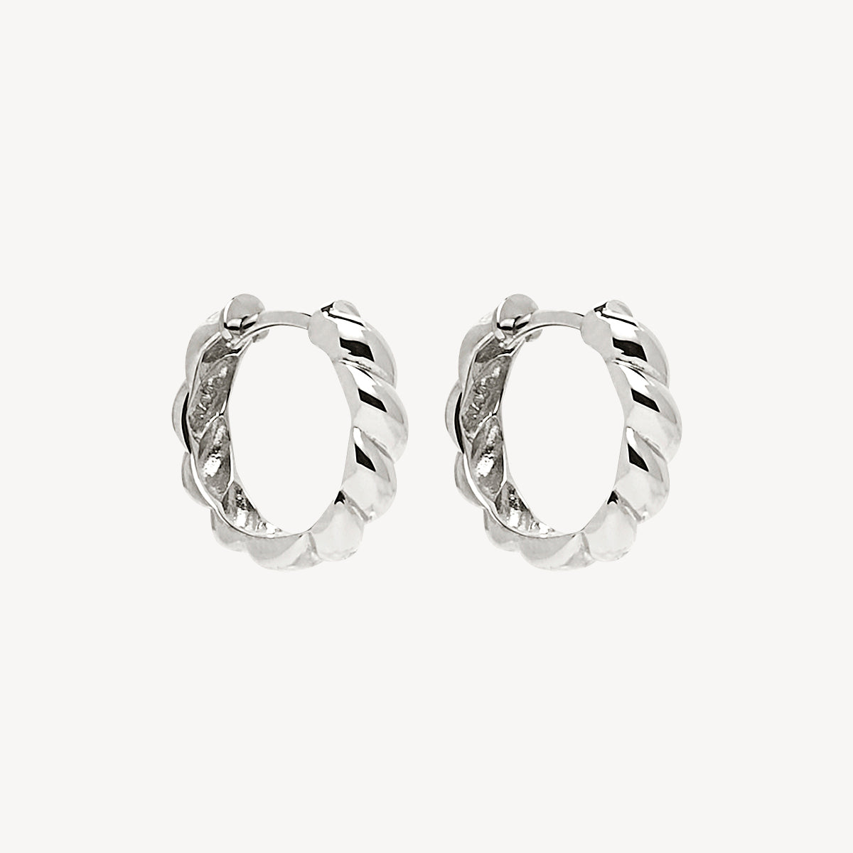 Evoking the imprints of water ripples left on Avalon’s sand, these super-social huggies love accompanying you everywhere! Gleaming sterling silver has been artfully sculpted into a wavy effect with a hinged fastening for easy adornment. Available in sterling silver, 14kt yellow gold and rose gold plate 4mm x 16mm twist patterned round huggies