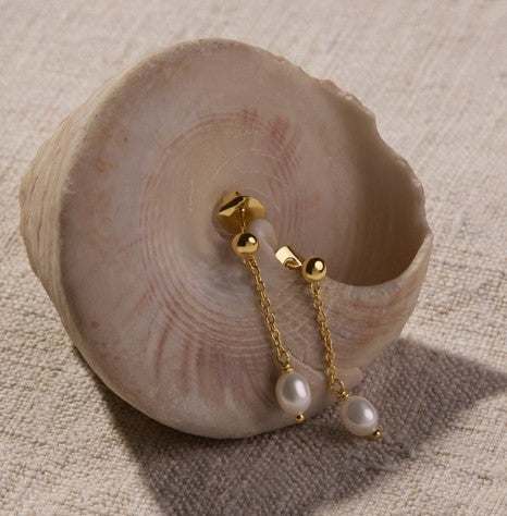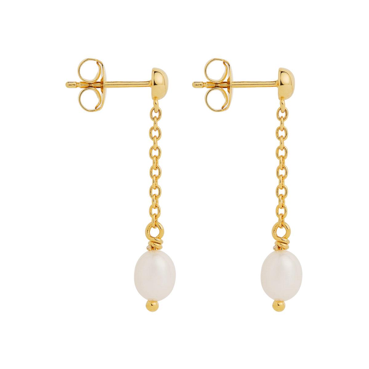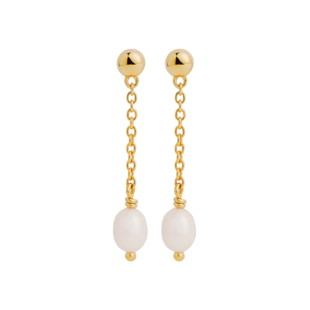 5X6mm White rice pearl and yellow gold plated chain drop earrings with stud fitting.