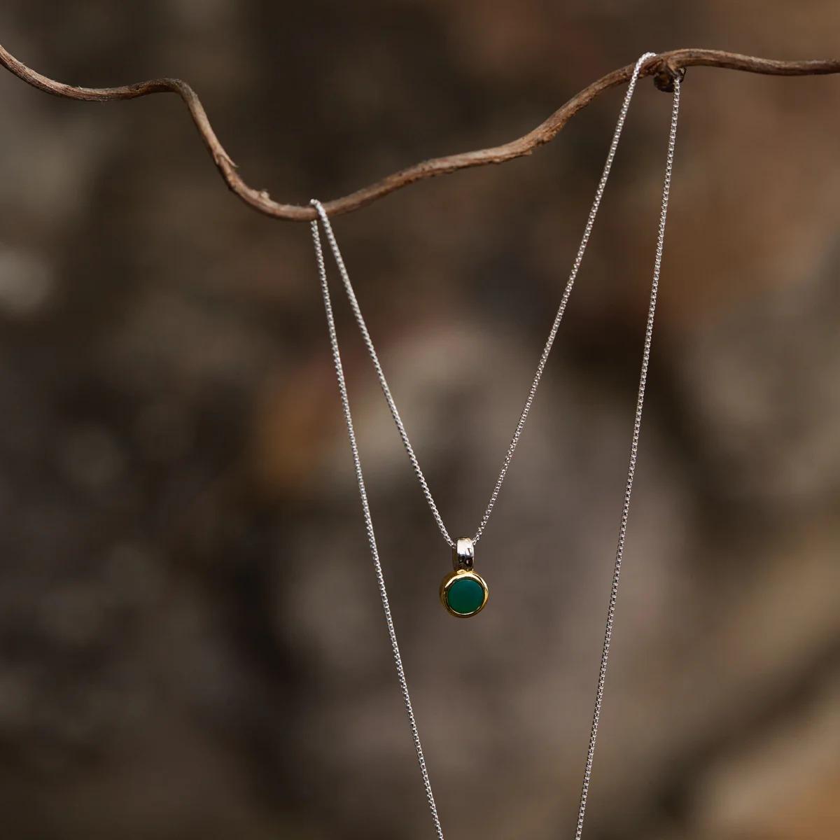 A masterclass in elegance and versatility, the Solace Necklace is a wearable pause, a moment of serenity. Her fusion of precious metals and soothing green onyx honours Australia’s elemental palette, transporting you to the heart of our ancient rainforests. Our expert silversmiths accentuate the gemstone’s verdancy in a yellow gold plated setting with a contrasting silver bale. Style her as a solo statement or use her two-tone beauty for captivating gold and silver layering.