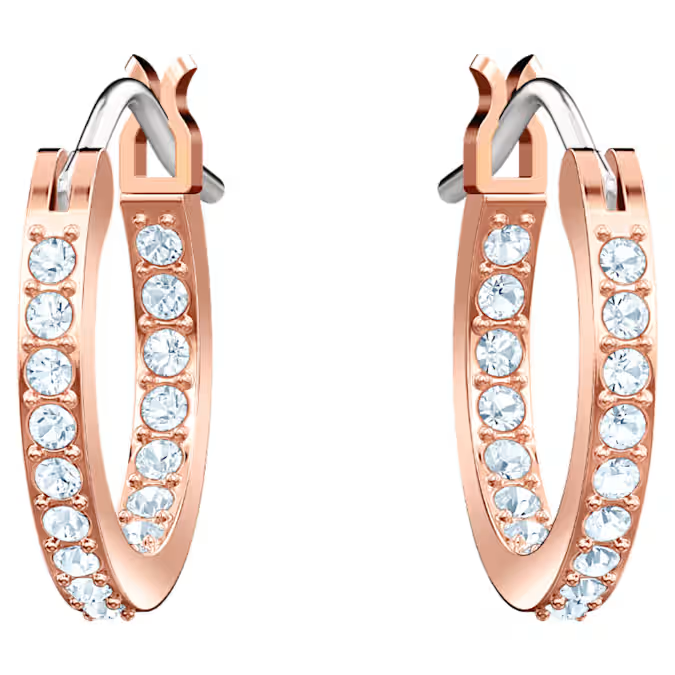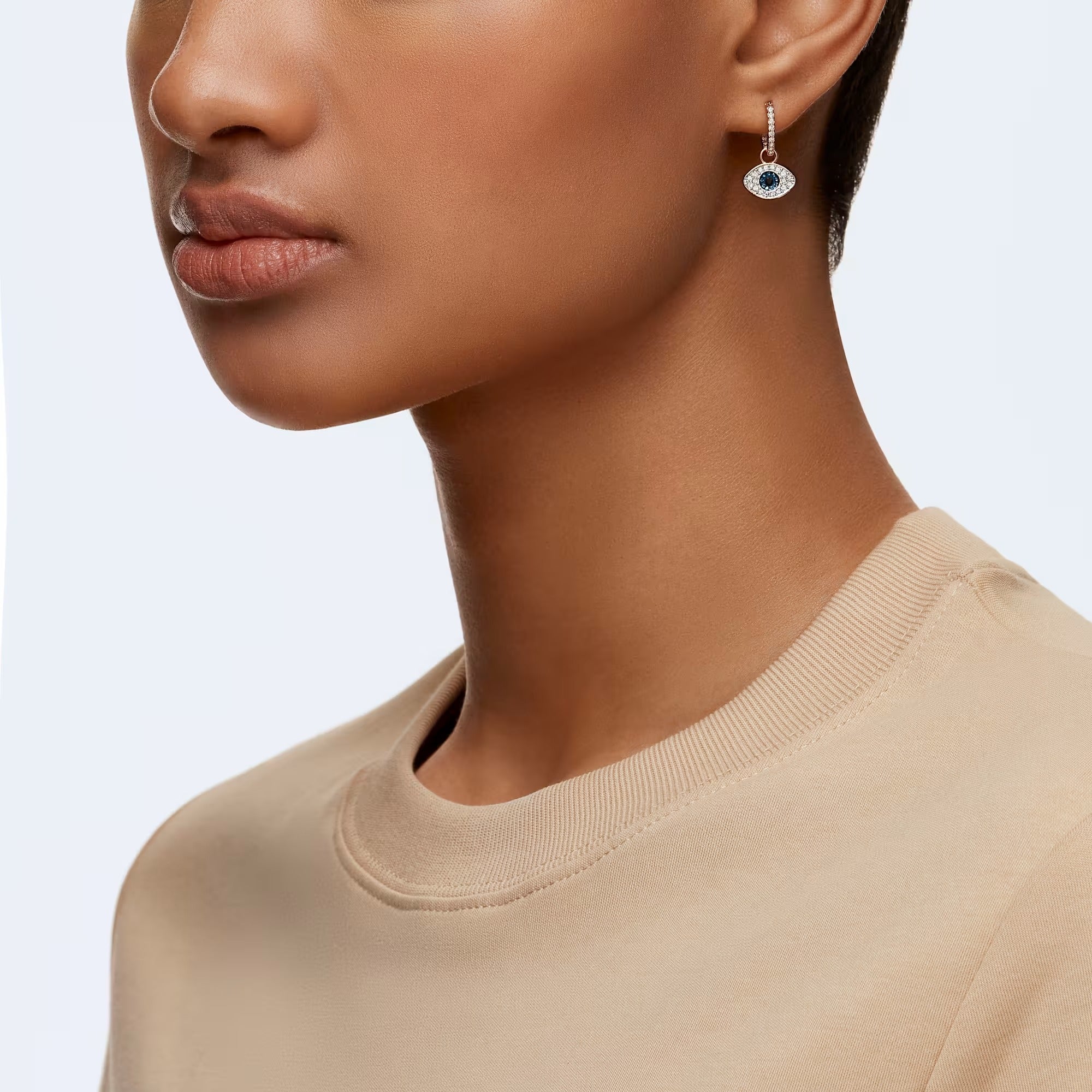 Dial up your fashion credentials with this versatile pair of hoop earrings in rose gold plating. A play on the classic evil eye symbol, they feature the protective talisman embellished in clear, blue and black pavé. Hanging from classic clear pavé hoops, the eye motifs can be removed if desired. Certain to add a sense of cool and romantic glamour to even the most casual outfit.