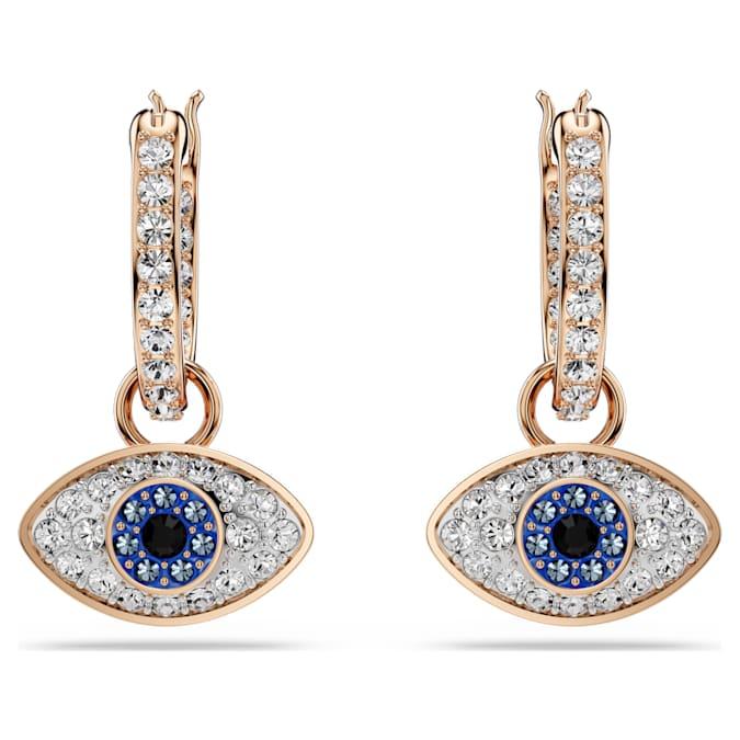 une into your spiritual side with these rose gold-tone plated earrings. Suspended from classic pavé hoops, the domed evil eye motifs are adorned with clear, blue and black pavé. A play on the traditional talisman symbol, these earrings will infuse any outfit with a touch of mystical glamour.